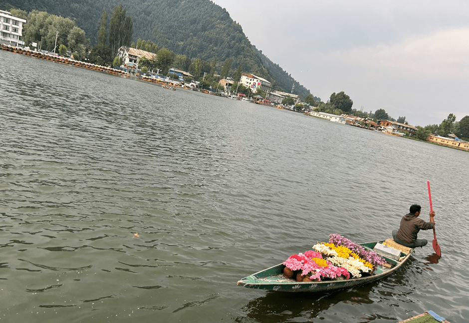 As I sat peacefully enjoying the hustle bustle, I was amused to see the intense commercial activities going around me. The shikharas were the carts and hawkers we see on our roads. I saw hawkers on shikharas selling every imaginable thing—cosmetics, jewelry, souvenirs, fruit, snacks, tea, coffee, drinks, flowers, winter and summer clothes, and one of them even called out to me for a foot massage.