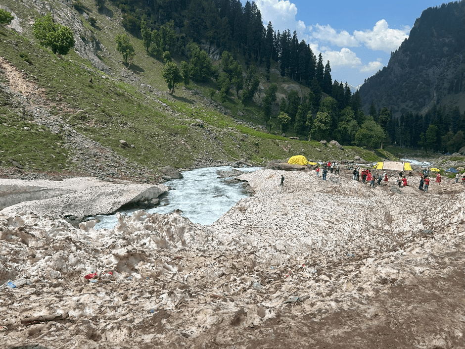 We reached Chandanwadi and walked up to the trail from where the Amarnath Yatra starts. There was busy preparation all around for the annual Yatra as it was just a month away. Chandanwadi had a strip of glacier but it was getting slushy. On the way to the glacier, many hawkers kept accosting us, some with local wares and others with global wares such as wafers and cold drinks, but as usual brisk business along the trail. A few wanted to place a rabbit or a pigeon or a kid (baby goat) on our hands and then pose for photos.