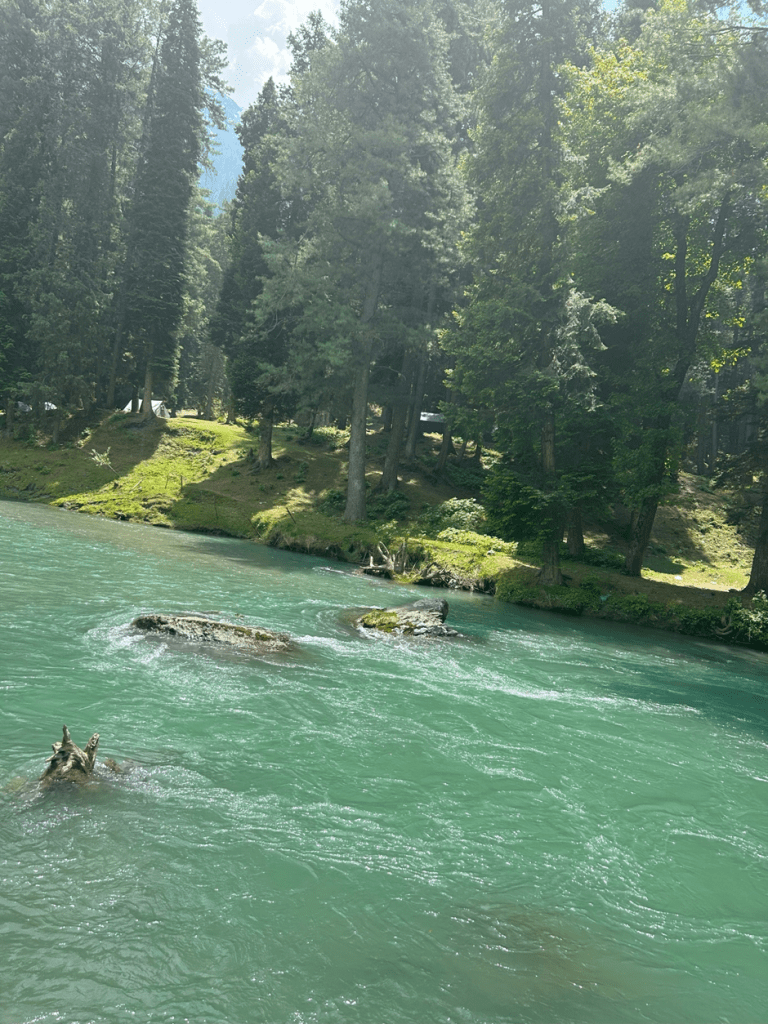 I wasn’t too impressed by Chandanwadi specially due to the crowd and the ice slush but our next stop Betaab valley was mesmerizing. This is where the film Betaab was shot and thus the name, but originally called Harjan valley. Getting plush money, the area was beautifully maintained, with tall fir and pine trees, dotted with several eateries, and the same gurgling river Lidder flowing, but much calmer. Maybe just relaxing in this peaceful surrounding, soaking it in, like we were doing, before its joie de vivre again.  I went down to the river where it was very shallow. But one bare foot into the water and my head to toe froze. It was icy cold.